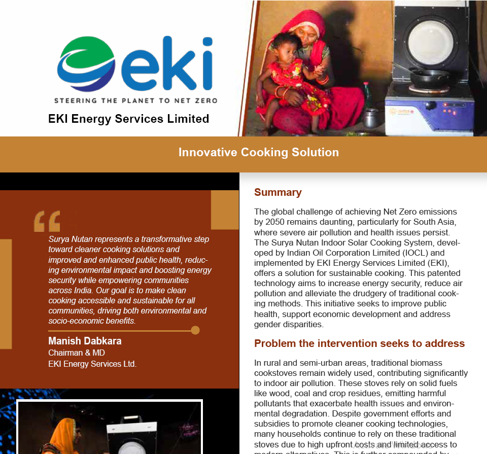 Surya Nutan distribution project features as a case study in the esteemed compendium released by the Confederation of Indian Industry (CII), underscoring EKI’s pivotal role in advancing clean cooking initiatives and its dedication to sustainable energy solutions. The Surya Nutan project, which utilizes innovative solar-powered PV cell technology, has been selected for its potential to address pressing social and environmental challenges. The compendium showcases EKI’s successful implementation of the project and its positive impact on communities. By featuring EKI’s work, the CII aims to inspire other organizations and individuals to adopt sustainable practices and contribute to a cleaner and greener future.